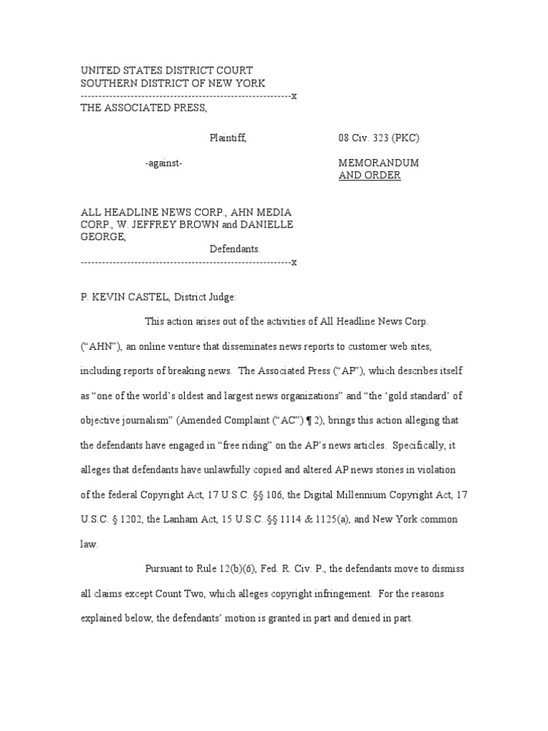 Title : Decision Ap Hot News Doctrine Associated Press Digital Millennium Copyright Act Source : www.scribd.com Open New Window